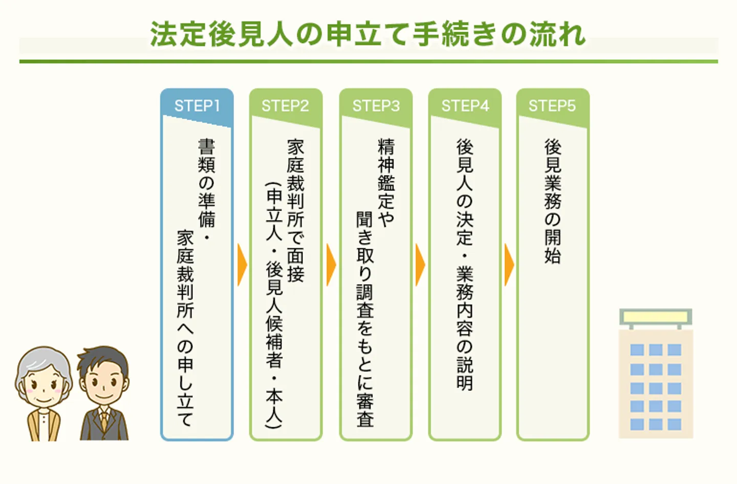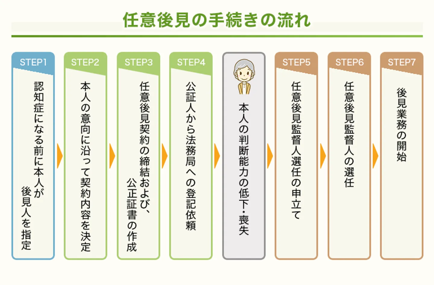 本人の判断能力が低下したら、任意後見制度を開始するために、家族や後見人が家庭裁判所へ申し立てます。