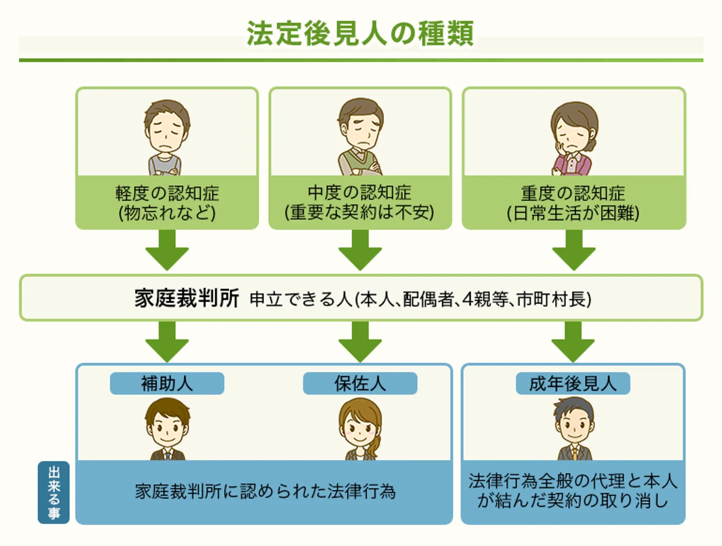 法定後見制度は、意思決定能力や判断力がどれくらい低下しているかによって、後見人のおこなえる業務を下記の3つにわけています。
