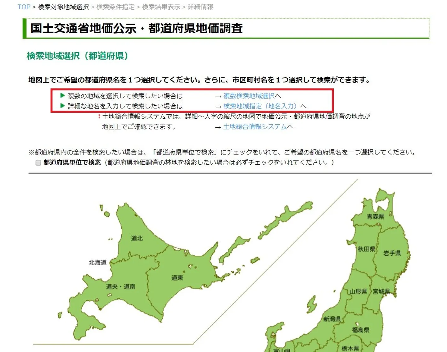 まず、このサイトでは複数の地域(複数検索地域選択)から調べる方法と、詳細な地名(検索地域指定)から調べる方法があります。複数の地域で調べるよりも、詳細な地名で調べたほうが分かりやすいでしょう。