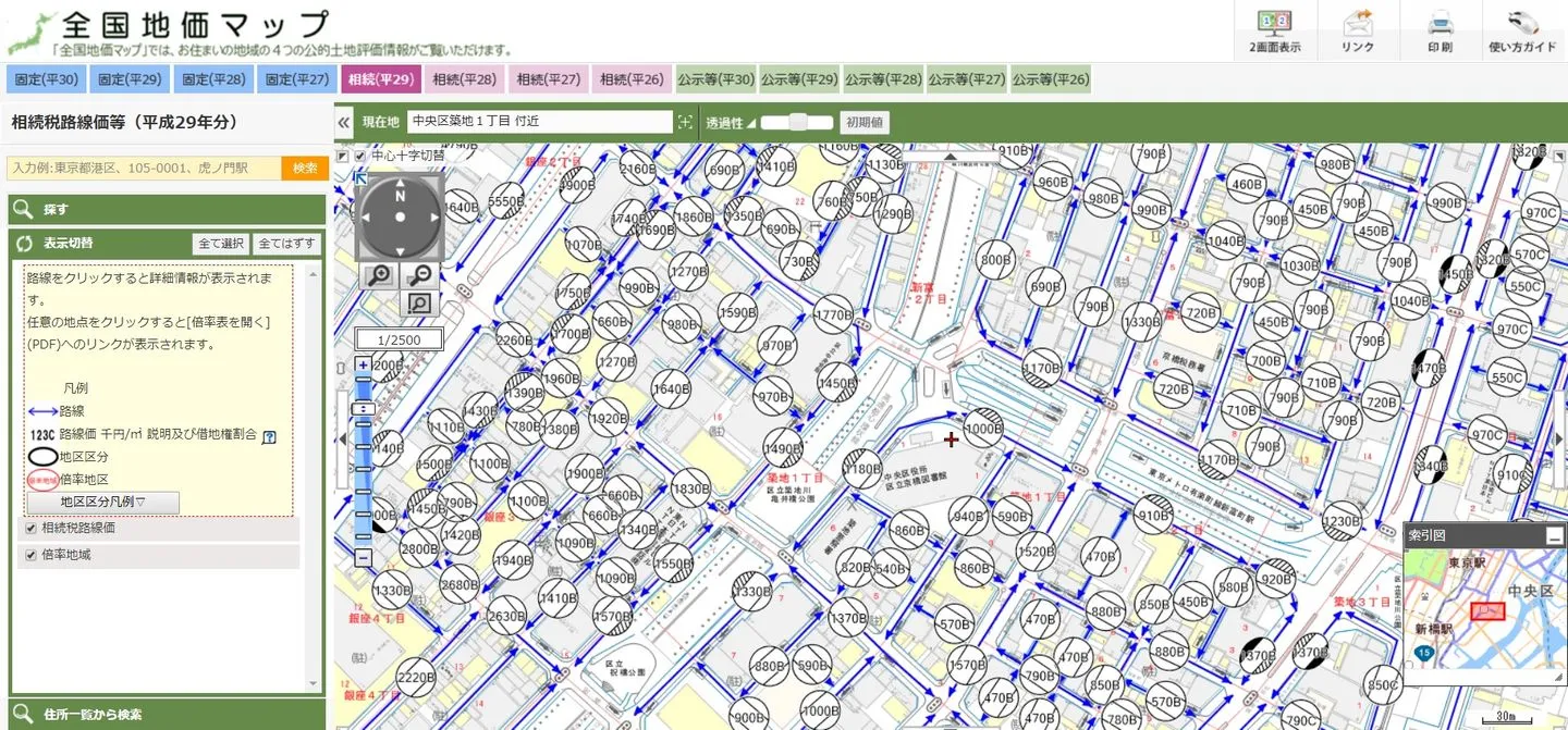 今回は東京都の中央区付近の路線価図を表示してみました。