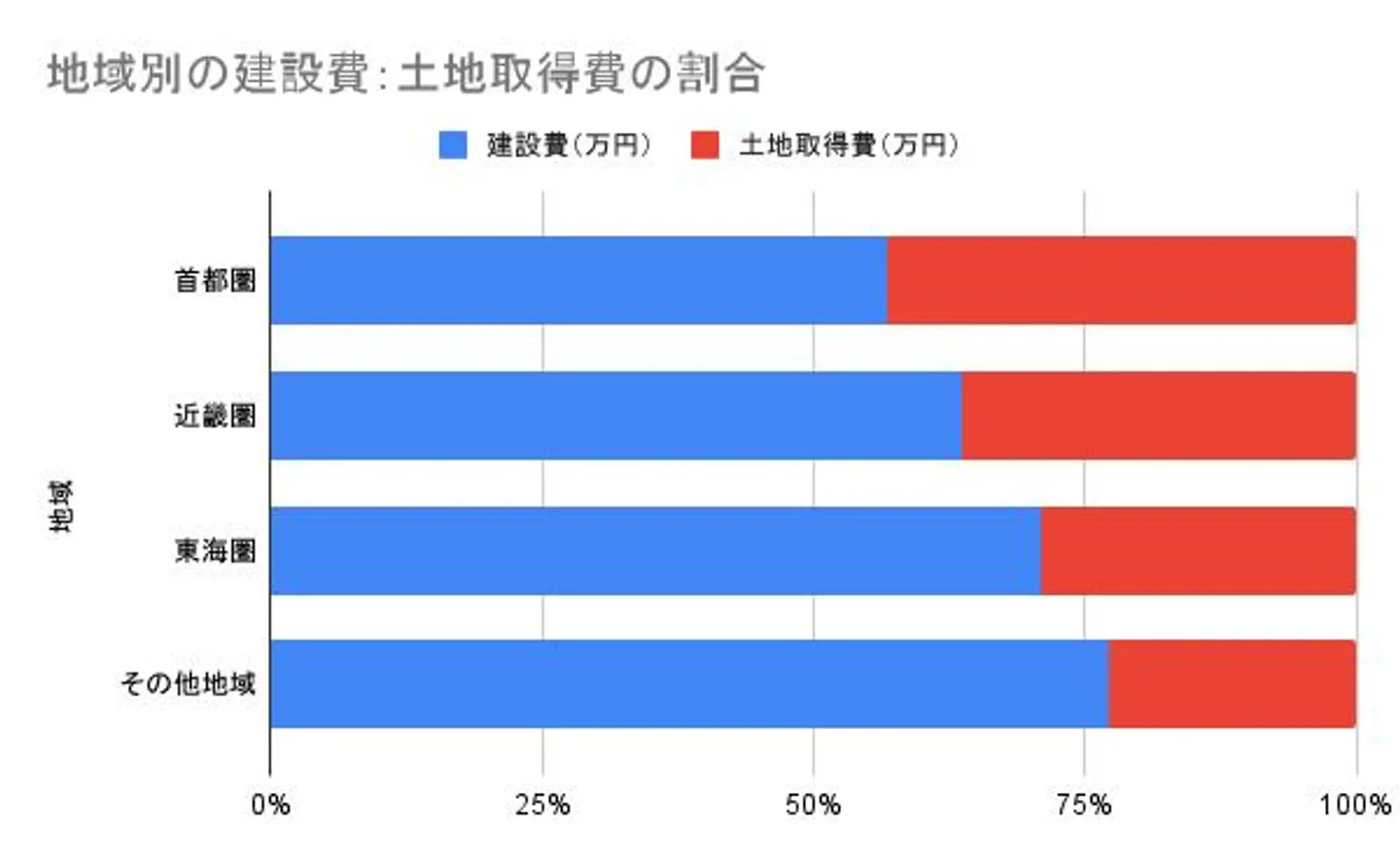 地価の高い都市部ほど土地の価格比率が上がり、地価の安い地方ほど建物比率が上がります。