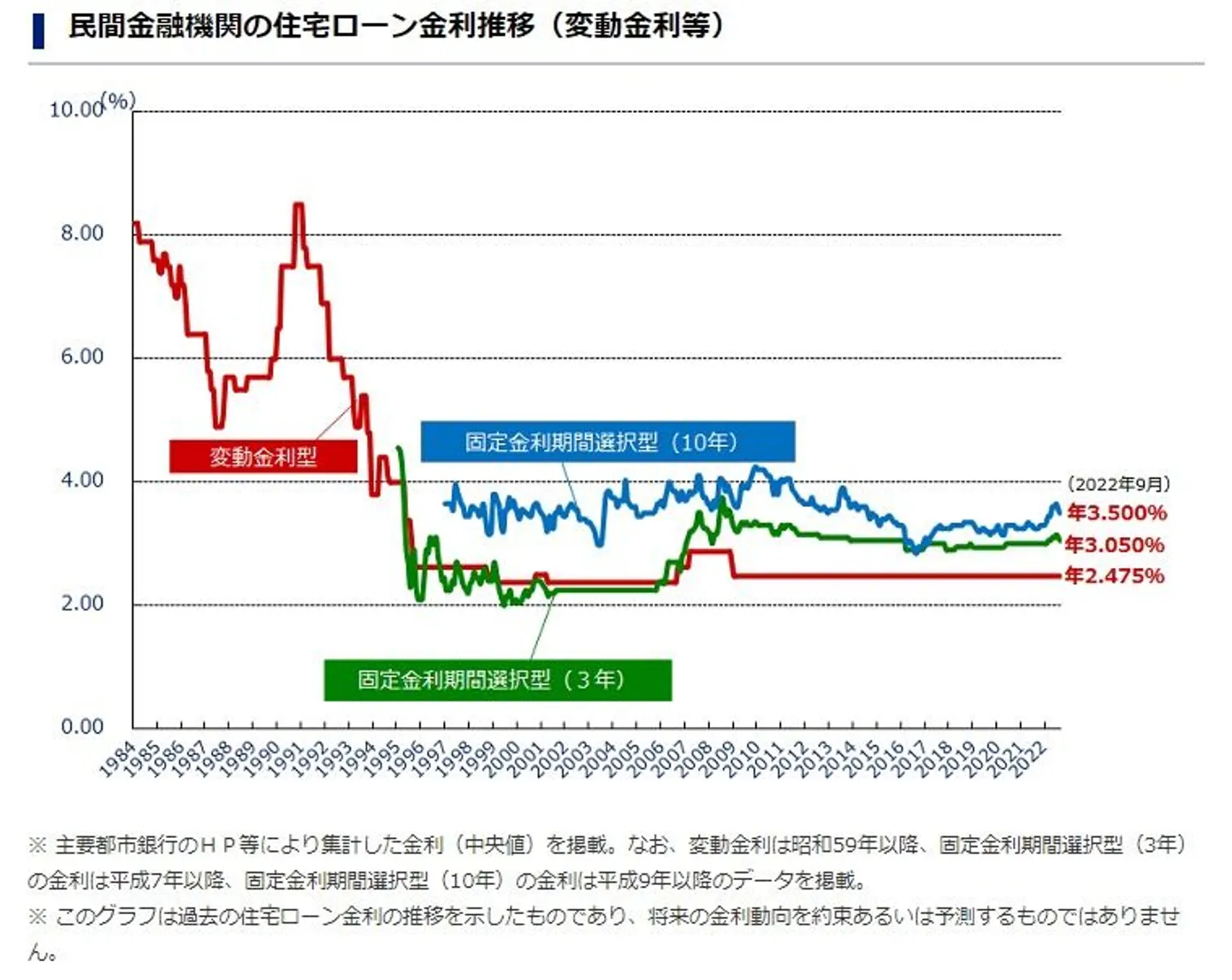 例えば、主要都市銀行の変動金利は、1984年で中央値8.5%だったものが、2022年では年2.475%で推移しています。