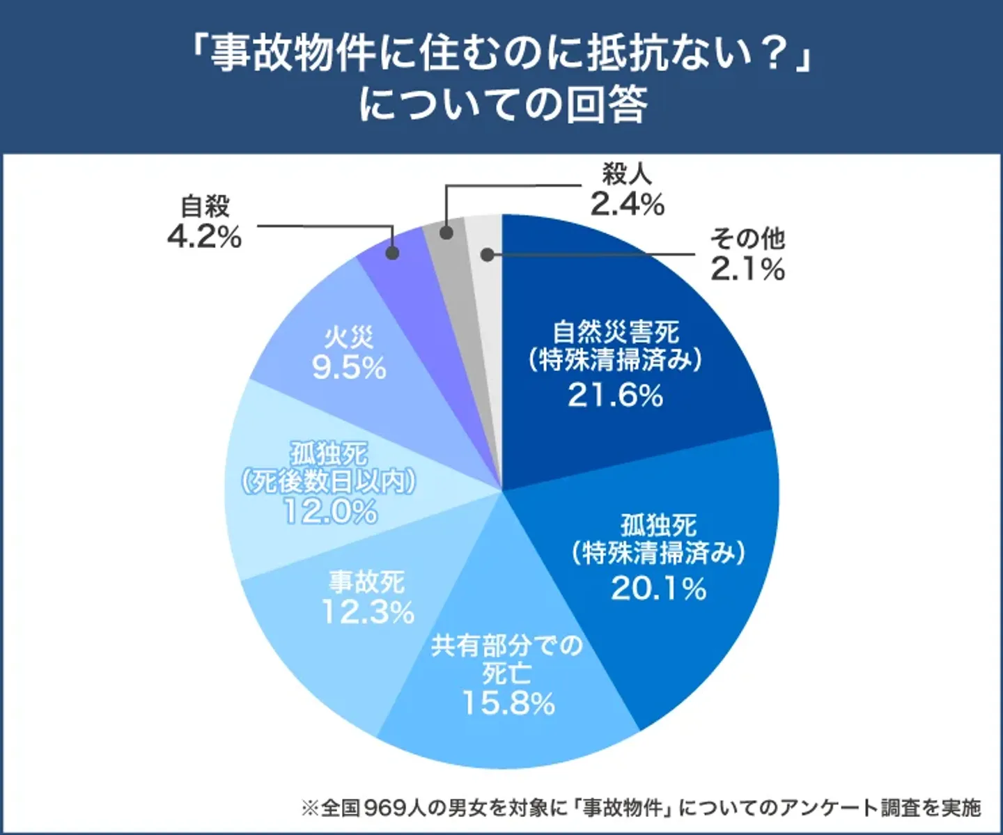 実際に、弊社で行ったアンケートでは「死因が孤独死であれば気にならない」と回答した人の割合は20.1%でした。これは「自然災害による死亡(21.6%)」に次いで高い結果であり、自殺や他殺と比べると抵抗感が少ないことがわかります。