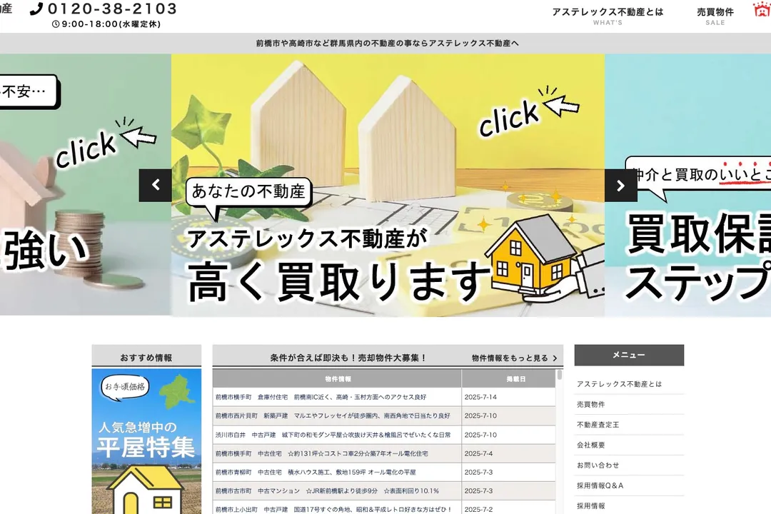 株式会社アステレックス不動産は、高崎市を拠点に、地域に密着した不動産買取を手がける会社です。相続で引き継いだ空き家や老朽化した戸建て住宅、使わなくなったマンション、さらには事業用物件まで、幅広い種類の不動産に対応しています。また、現状のまま買取可能となっており、売却前の片付けや修繕、リフォームといった手間をかけずに、遠方にお住まいの方や高齢者の方にとっても相談しやすい体制が整っています。